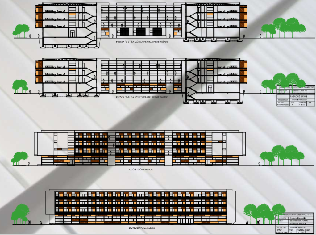 In order to solve the problem of lacking places in student dorms in Nis, the project was to be elaborated for the housing of 400 students at the site of Technical faculties’ campus. The aim was to adequately integrate the dorm structure into the existing civil housing surrounding and faculty neighborhood and therefore achieve development of the whole area in the future.